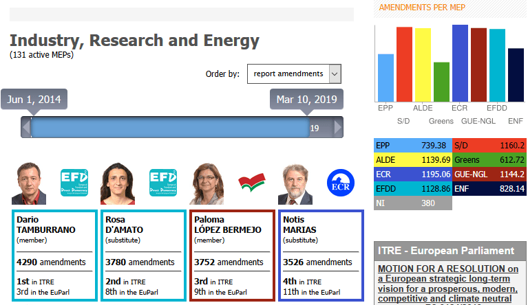 Risulta che per il numero di emendamenti presentati sono il terzo assoluto in tutto il Parlamento e il primo nella commissione parlamentare ITRE, della quale faccio parte e che si occupa di energia, industria, ricerca e telecomunicazioni. Un emendamento è la richiesta di modificare un testo legislativo o non legislativo. La presentazione degli emendamenti è il cuore dell’attività parlamentare. Certo, è possibile emendare anche le virgole, tanto per fare, è possibile visionare molti degli emendamenti fatti e il loro contenuto cercando in questo blog con la “parola chiave Tamburrano“.